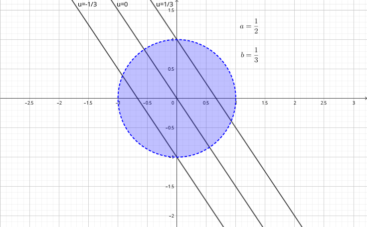 Так вот, в нашем случае \[ \left|\begin{array}{cc} u'_{x} & u'_{y}\\ v'_{x} & v'_{y} \end{array}\right|=\left|\begin{array}{cc} a & b\\ -b & a \end{array}\right|=a^{2}+b^{2}=\frac{1}{J},\qquad J=\frac{1}{a^{2}+b^{2}}. \] Теперь у нас есть всё для перехода в интеграле к новым переменным \[ \iint\limits _{x^{2}+y^{2}\leqslant1}f\left(ax+by+c\right)dxdy=\iint\limits _{u^{2}+v^{2}\leqslant a^{2}+b^{2}}\frac{f\left(u+c\right)}{a^{2}+b^{2}}dudv= \] для краткости временно обозначим $a^{2}+b^{2}\equiv R^{2}$ ($R$ - это радиус круга интегрирования в новых переменных) \[ =\frac{1}{R^{2}}\iint\limits _{u^{2}+v^{2}\leqslant R^{2}}f\left(u+c\right)dudv=\frac{1}{R^{2}}\int\limits _{-R}^{R}du\int\limits _{-\sqrt{R^{2}-u^{2}}}^{\sqrt{R^{2}-u^{2}}}f\left(u+c\right)dv=\frac{1}{R^{2}}\int\limits _{-R}^{R}f\left(u+c\right)du\int\limits _{-\sqrt{R^{2}-u^{2}}}^{\sqrt{R^{2}-u^{2}}}dv= \] \[ =\frac{1}{R^{2}}\int\limits _{-R}^{R}f\left(u+c\right)du\left[\sqrt{R^{2}-u^{2}}-\left(-\sqrt{R^{2}-u^{2}}\right)\right]=\frac{2}{R^{2}}\int\limits _{-R}^{R}\sqrt{R^{2}-u^{2}}f\left(u+c\right)du= \] и в качестве последнего штриха переобозначим обратно \[ =\frac{2}{a^{2}+b^{2}}\int\limits _{-\sqrt{a^{2}+b^{2}}}^{\sqrt{a^{2}+b^{2}}}\sqrt{a^{2}+b^{2}-u^{2}}f\left(u+c\right)du. \]