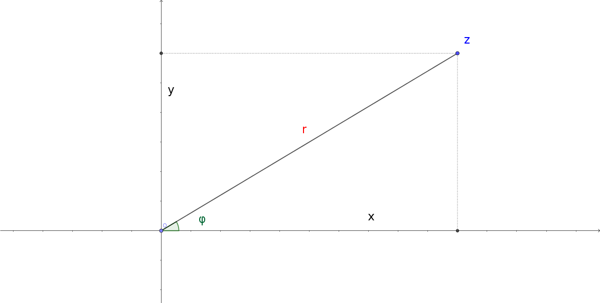 Действительную и мнимую части можно выразить через полярные координаты на той же плоскости: \[ \left\{ \begin{array}{c} x=r\cos\varphi,\\ y=r\sin\varphi, \end{array}\right. \] \[ z=\left(x,y\right)=\left(r\cos\varphi,r\sin\varphi\right), \] где число $r$ называется модулем числа $z$, а $\varphi$ - аргументом числа $z$. Так как $r^{2}=x^{2}+y^{2}$, $r$ имеет геометрический смысл расстояния от точки на комплексной плоскости до начала координат (нуля).
