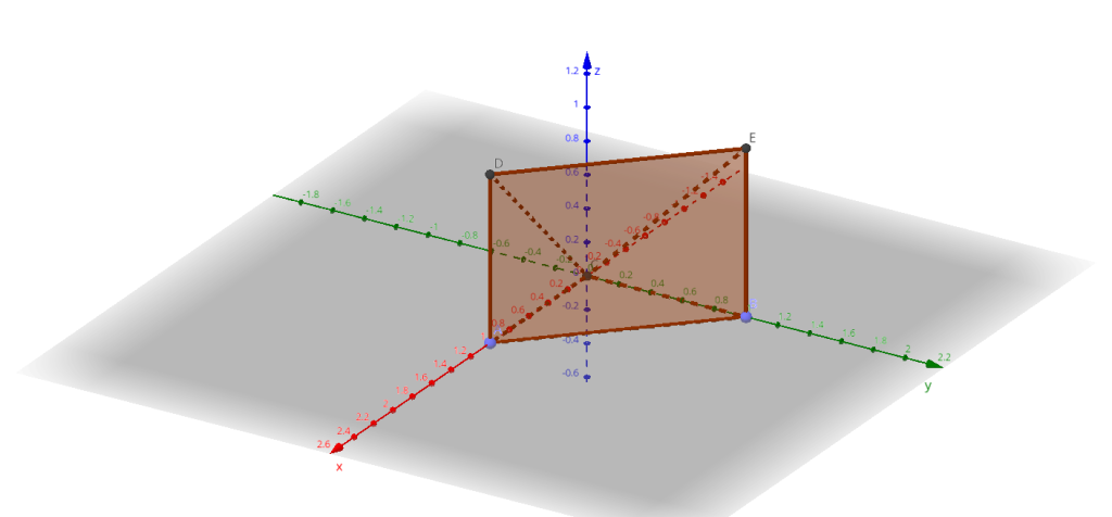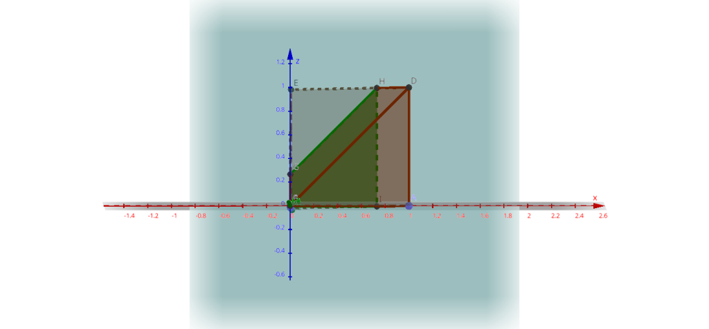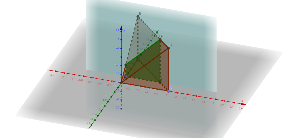 Сечение образует зелёную трапецию, которая при $y=0$ превращается в треугольную грань фигуры на плоскости $\left(x,z\right)$, а при $y=1$ вырождается в ребро $BE$: