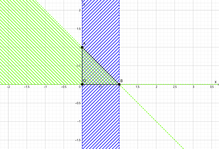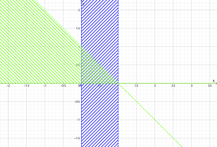 Далее строим прямые $y=0$ и $y=1-x$, и выделяем область, где $0\leqslant y\leqslant1-x$. Это будет угол: