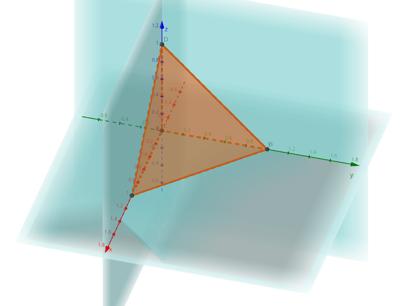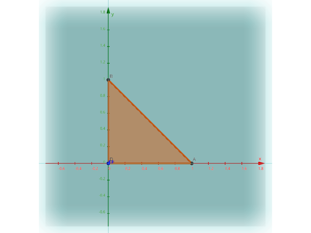 Разумеется, если добавить ось $z$, то треугольник превращается в трубу треугольного сечения, перпендикулярную плоскости чертежа. Сверху и снизу от этой трубы отсекается некая часть: плоскостью $z=0$, т.е. плоскостью $\left(x,y\right)$, и плоскостью $z=x+y$. Сечение треугольной трубы плоскостью $z=x+y$ представляет собой тоже треугольник, образованный пересечениями плоскости $z=x+y$ с рёбрами трубы: осью $z$ и двумя параллельными ей осями, проходящими через точки $A$ и $B$. На пересечении с осью $z$ $x=y=0$, $z=x+y=0+0=0$, и это пересечение произойдёт в начале координат. Над точками $A$ и $B$, имеющими координаты $\left(1,0\right)$ и $\left(0,1\right)$, $z=1$. Снизу труба закрывается уже построенным треугольником $\triangle AOB$, порождая замкнутое тело (это будет пирамида, лежащая на боку с вершиной в точке $O$):